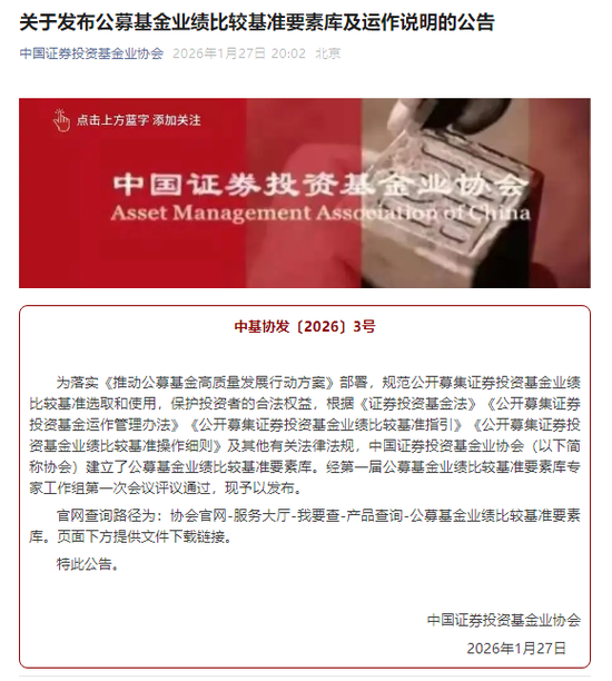 《指引》明确,协会依据法律、行政法规和自律规则,对业绩比较基准的选取和使用进行自律管理,建立并维护基金行业业绩比较基准要素库。